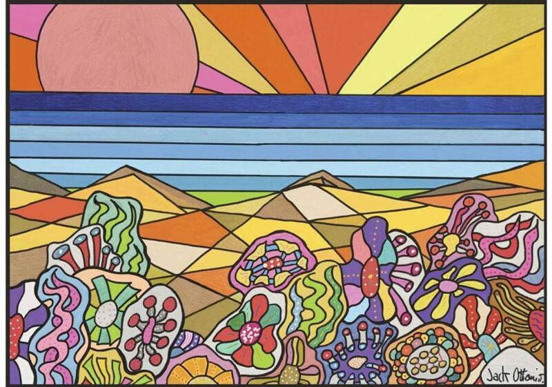 A Ravensburger 1000 db-os puzzle - Kavicsok Hawaii (12001240) kirakó képén Jack Ottani vidám absztrakt alkotását láthatjuk.