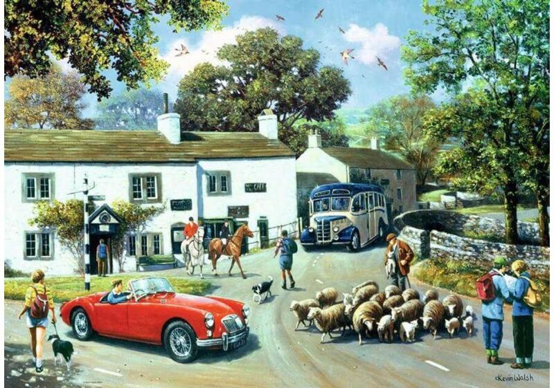 Ravensburger 1000 db-os puzzle - The Dales (12001256) kirakó nosztalgikus hangulatú angol vidékre repít minket: az úton lovak és birkák színesítik a forgalmat.