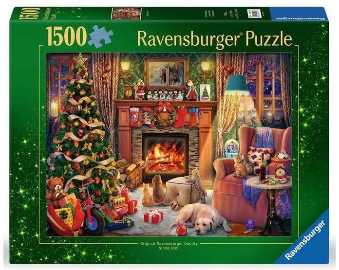 Ravensburger 1500 db-os puzzle - Christmas Edition - Szenteste  képén egy díszes nappali jelenik meg ünnepi hangulatban és házi kedvencekkel.