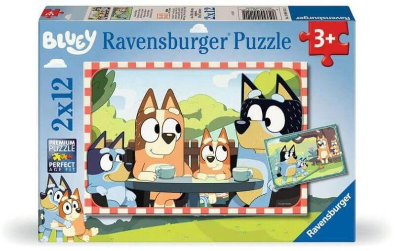A Ravensburger 2 x 12 db-os puzzle - Bluey (12004111) kirakó képein az aranyos kék kutyust, Bluey és családtagjai elevenednek meg.