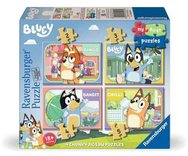 Az Ravensburger 4 az 1-ben My first puzzle (2,3, 4,5 db-os) - Bluey (12004105) képein az aranyos kék kutya, Bluey és családja, Bingo, Szimat és Csibész kelnek életre.