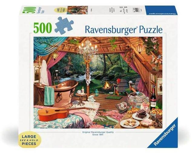 Egy forró fürdő, kényelmes ágy és sok-sok finomság az asztalon, idilli természet: itt minden adott egy igazi luxus kempingezéshez! Fedezd fel a csodás részleteket és kapcsolódj ki a Ravensburger 500 db-os puzzle - Glamping (12000825) kirakóval!