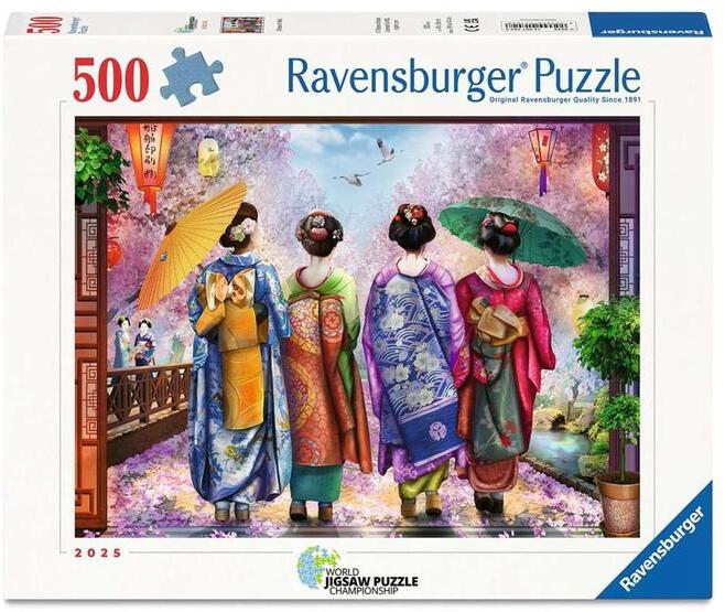 Négy szépséges gésa sétál a tavaszi cseresznyefa virágzás idején egy pompás parkban. A Ravensburger 500 db-os puzzle - World Jigsaw Puzzle Championship - Séta a virágzásban (12001702) színes jelenete örömteli, könnyed kirakózást kínál. A kirakó kifejezetten a nagyszabású nemzetközi verseny, a World Jigsaw Puzzle Championship alkalmából készült.