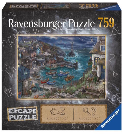 A Ravensburger Escape puzzle elhozza neked a szabadulószobák izgalmát! Olvasd el a történetet, rakd ki a képet és oldd meg a rejtélyes feladványokat, melyek mindegyikét részrejtvényekből állíthatsz össze! Ha elakadsz, a QR kód beolvasásával segítséget kaphatsz, a végső megfejtést pedig a boríték rejti. A titkokkal átszőtt illusztráció a játékost egy halászfaluba invitálja, amit épp egy hatalmas vihar támad meg. A szikla tetején lévő világítótorony nem működik, egy nagy teherhajó pedig gyanútlanul  a sziklás partok felé tart. Meg tudod oldani a kihívásokat, hogy végül még időben bekapcsold a jelzőfényeket?