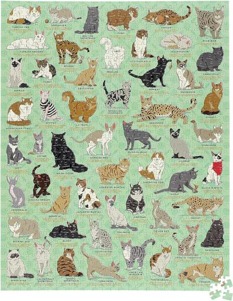 Macskarajongók figyelem! Prémium minőségű 1000 db-os puzzle, mely kézzel illusztrált 54 fajta macskát, és azok legfontosabb jellemzőit tartalmazza.