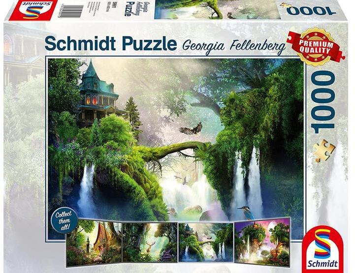 Schmidt 1000 db-os puzzle -  Enchanted spring, Georgia Fellenberg képe egy forrást ábrázol a természet ragyogó színeivel, egy kísértetiesen szép házzal a vízesés tetején.