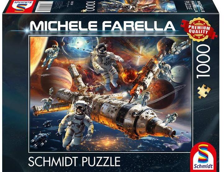 A Schmidt 1000 db-os puzzle - Galactic Magic, Weightless in Space Michele Farella alkotása. A képen egy űrközpontot látunk, súlytalanságban lebegő asztronautákat, bolygókat és még néhány azonosítatlan repülő tárgyat is felfedezhetünk.