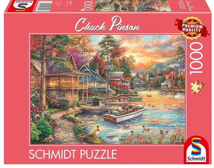 A nap utolsó sugarai aranyba vonják a vizet és a fákat, a csónakok már visszatértek a kikötőbe és a kacsák is hazafelé igyekeznek: ilyen egy este a víz mellett. Éld át a nyugodt tengerparti idillt a Schmidt 1000 db-os puzzle - Golden Evening at the Shore (58553)  kirakóval! A kp Chuck Pinson alkotása.