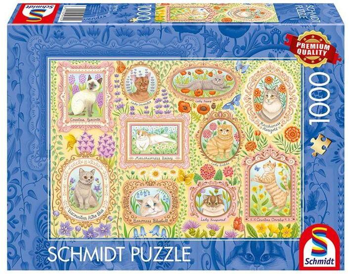 Cica rajongóknak készült a Schmidt 1000 db-os puzzle - Noble Cats in Floral Splendor (59792)  kirakó. A vidám képen cuki macskaarisztokratákat láthatunk virágok ölelésében.