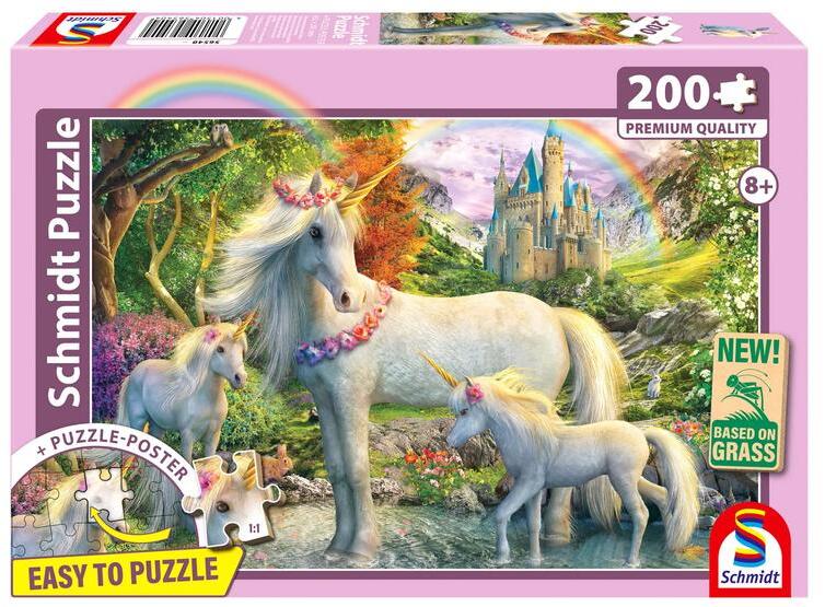 A Schmidt 200 db-os puzzle - Unicorn Mare with Two Foals (56540)  kirakó képén egy szépséges unikornist láthatunk a játékos csikóival. A puzzle doboza egy kiváló minőségű posztert is tartalmaz, ami megkönnyítheti a kirakózást! Ráadásul ez a puzzle igazán környezetbarát választás, hiszen 40 százalékban fűből és 60 százalékban újrahasznosított papírból készült. Ezt az erőforrás-takarékos és fenntartható innovációt kifejezetten a német játék- és puzzlekiadó számára fejlesztették ki.