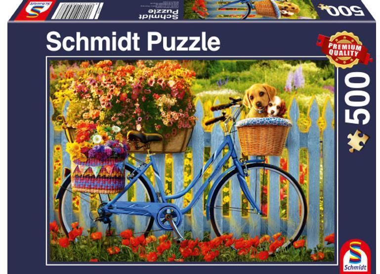 A Schmidt 500 db-os puzzle - Sunday outing with good friends című képén egyszerűen elveszünk a virágok szépségében és a két kutyus csillogó tekintetében. Idili környezet egy vasárnapi kerékpározáshoz.