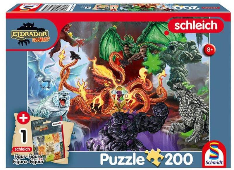 A Schmidt 200 db-os Schleich puzzle figurával - Eldrador Creatures (56566)  kirakott képén sárkányok és mindenféle mesebeli lények kelnek életre. A gyerekeknek készült kirakó dobozában egy darab eredeti Schleich figura is található.