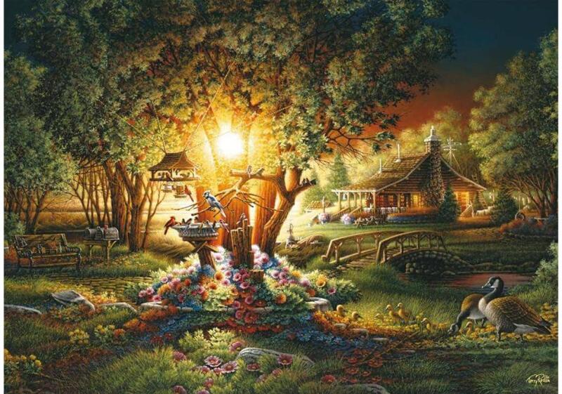 A Schmidt 1000 db-os puzzle - Magnificent Spring Lights  kirakó Terry Redlin amerikai illusztrátor festményét ábrázolja. A képen egy csodás kertet láthatunk tavaszi pompában, szépséges virágokkal és madarakkal.