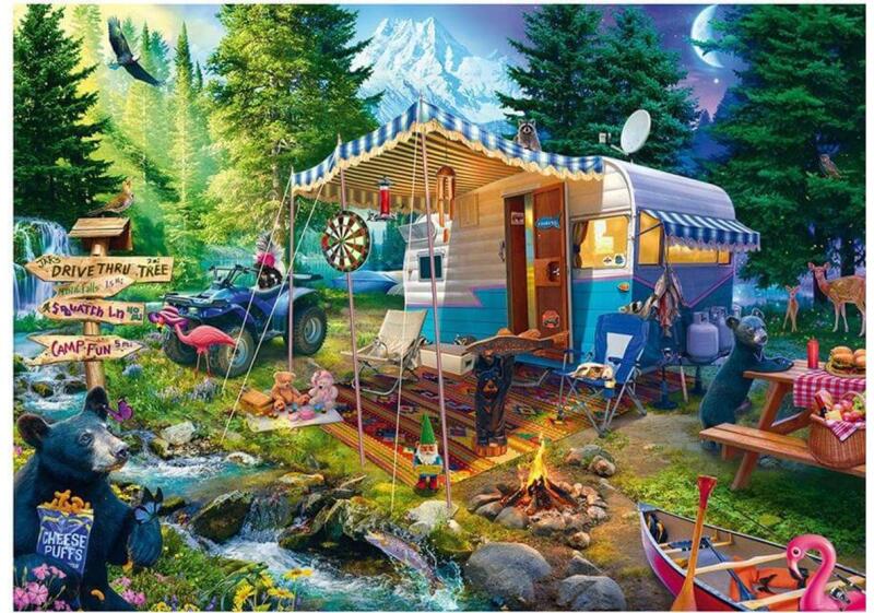 Fedezd fel a sok kedves és humoros részletet a Schmidt 1000 db-os puzzle - With the Caravan in the Mountains (58575)  kirakón! Jeff Haynie alotásán egy idilli hegyi kempingezés izgalmait élhetjük át. Itt nem lesz hiány kalandokban és mókában!