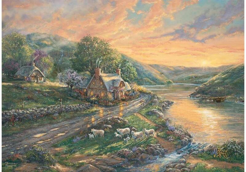 A Schmidt 1000 db-os puzzle - Dawn in Emerald Valley  kirakón Thomas Kinkade Hajnal a Smaragd-völgyben című festménye látható. A kép hangulata magával ragadó, békét sugároz: a nap még éppen csak felbukkant a hegyek között, a folyó partján vidám bárányok legelésznek.