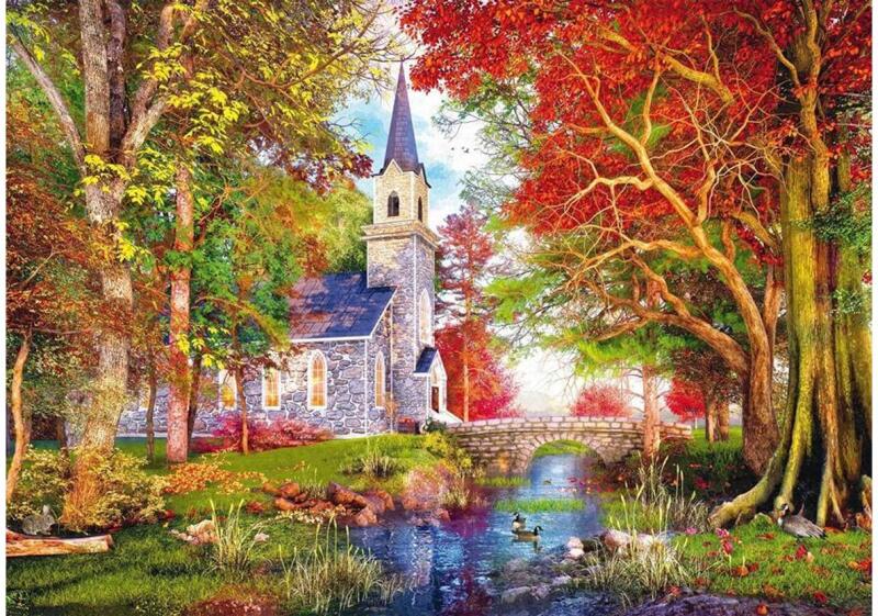 A Schmidt 1000 db-os puzzle - Chapel in autumn magic  című képen egy szépséges kápolnát látunk mesés őszi színben pompázó fákkal körülvéve. .