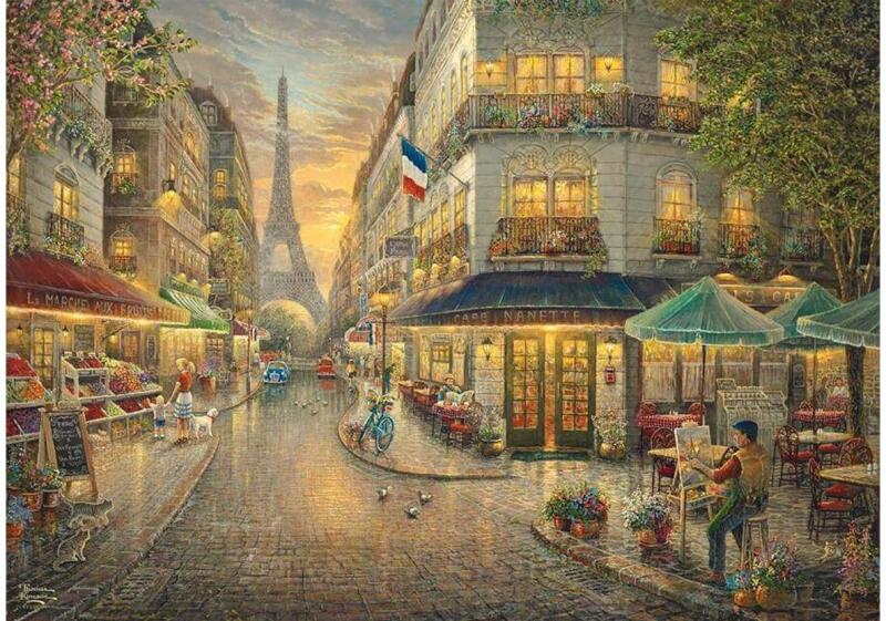 A Schmidt 1000 db-os puzzle - Picturesque Paris  kirakón Thomas Kinkade gyönyörű festménye látható. Egy tipikus párizsi utca, a házak aljában hangulatos üzletek, háttérben az Eiffel torony.