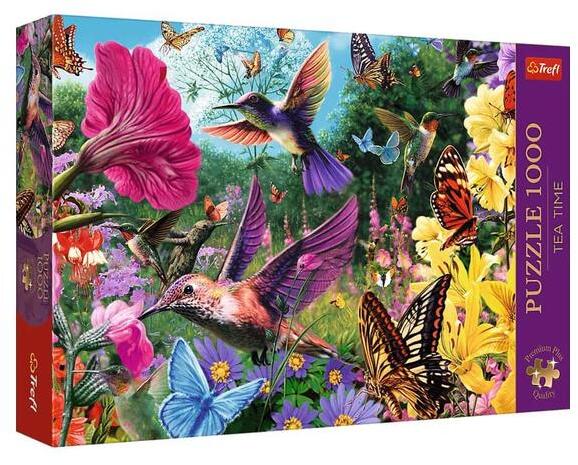Az új Trefl Premium Plus Quality puzzle kolleció kirakói vastagabb kartonból készültek és darabjai egyedi formájúak. A sorozat két témakört kínál: az Odyssey , egyedülálló fotókat fedezhet fel, amelyek a világ különböző szegleteit mutatják be más szemszögből, egy érdekes stílusban. A Tea Time pedig egy idilli, festett sorozat, nosztalgikus karakterű képek, más stílusban bemutatva, mint az eddig megszokott Trefl Original kínálatában. A Trefl 1000-db-os Premium Plus puzzle - Tea Time - Kolibri Kert (10806) című képen egy csodálkatos virágmezőn láthatóak a fenséges kolibri madarak.
