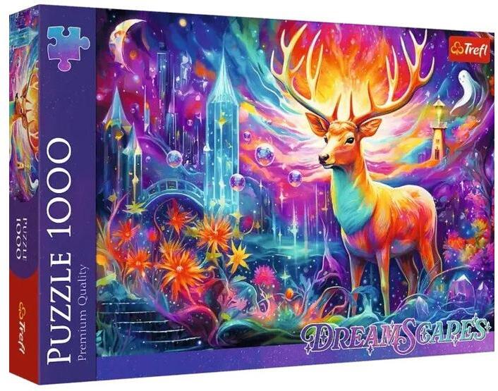 Színes álmok álmodóinak! A Trefl 1000 db-os puzzle - DreamScapes - Misztikus szarvas (10933)  kirakó képén egy fantáziadús álomvilágba csöppenünk, ahol a főszereplő egy csodás szarvas.