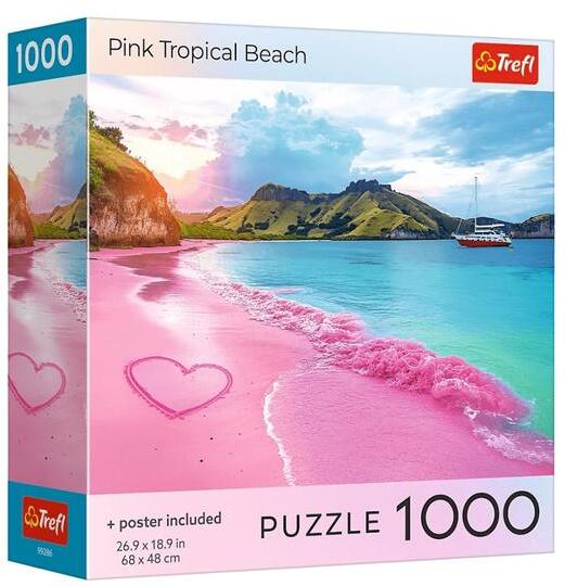 A Trefl  kirakók kiváló minőségű, speciális fényvisszaverő papír felhasználásával, ökológiai anyagból készülnek, amely megkönnyíti az összeillesztést. A Trefl 1000 db-os puzzle - Rózsaszín trópusi tengerpart (99286)  kirakó képen a Pink Tropical Beach látható, ahol a rózsaszín árnyalatok és a pálmafás tengerpart hangulata egzotikus nyári életérzést idéz.