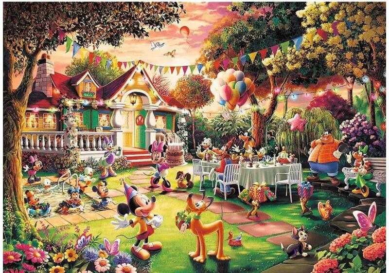 Mminnie, Plútó, Daisy, Goofy, Donald kacsa és a többiek mind eljöttek, hogy felköszöntsék Mickey egeret. Ünnepelj te is a kedvenc Disney figuráiddal és a Trefl 1000 db-os Premium Plus puzzle - Mickey egér szülinapja (10915)  kirakóval!