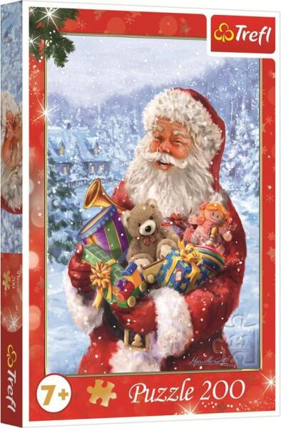 A kedves Télapó elevenedik meg a Trefl 13296 - Mikulás - 200 db-os puzzle képén gyönyörű hóesésben, sok-sok játékkal a kezében. Meseszép, nosztalgikus hangulatú ünnepi kirakó a kisebbeknek.