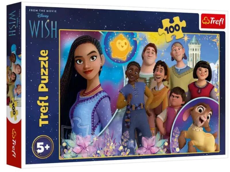 A Trefl 100 db-os puzzle - Disney - Wish (16474) kirakó  képe n a népszerű  Disney mese, a Wish szereplői láthatóak. .