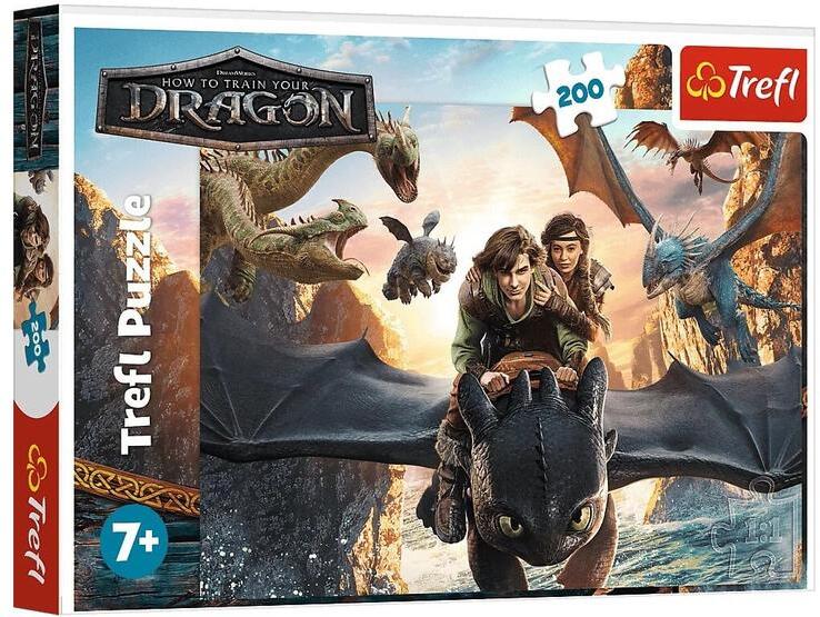 Fogatlan most is lendületesen szeli a felhőket! A Trefl 200 db-os puzzle - Így neveld a sárkányodat (13348)  lélegzetelállító sárkányos jelenete új kihívást nyújt a gyerekeknek.