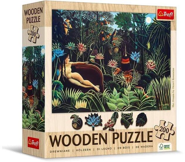 A Trefl 200 db-os Wooden Contour Fa Puzzle - Henri Rousseau - Az Álom (20253) kirakón Henri Rousseau híres festménye, The Dream  látható 1910-ből. A puzzle 5 egyedi formájú puzzle darabot tartalmaz.