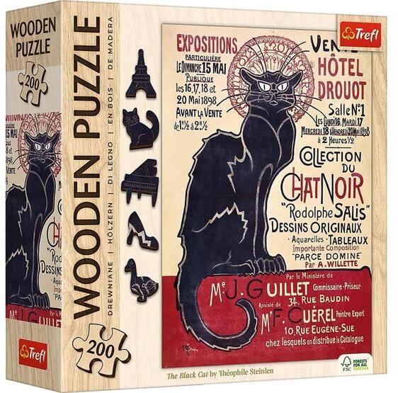 A Trefl 200 db-os Wooden Contour Fa Puzzle - Théophile Steinlen - A fekete macska (20254) kirakón a híres Le Chat noir plakát látható 1896-ból. A puzzle 5 egyedi formájú puzzle darabot tartalmaz.