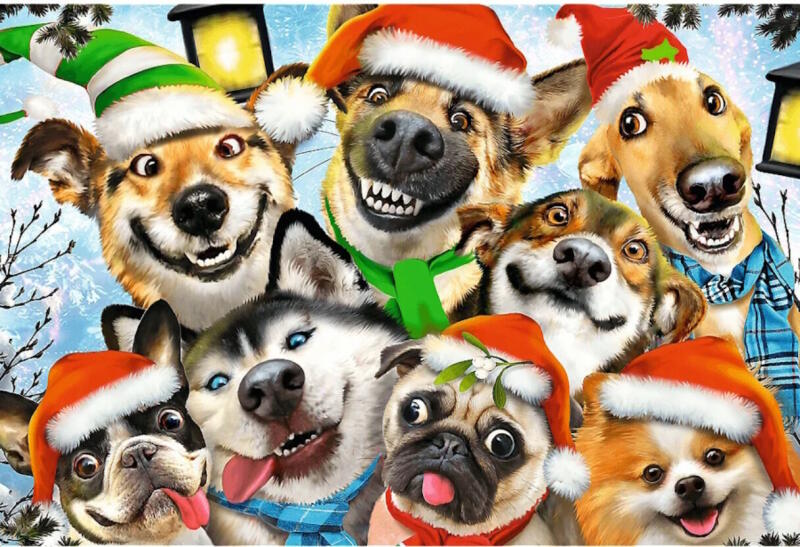 A Trefl 501 db-os Wood Craft Prémium Fa Puzzle - Kutyák karácsonya  című képen vidám bolondos kutyusok varázsolnak jó kedvet és ünnepi hangulatot. A puzzle 50 egyedi formájú figurát is tartalmaz.