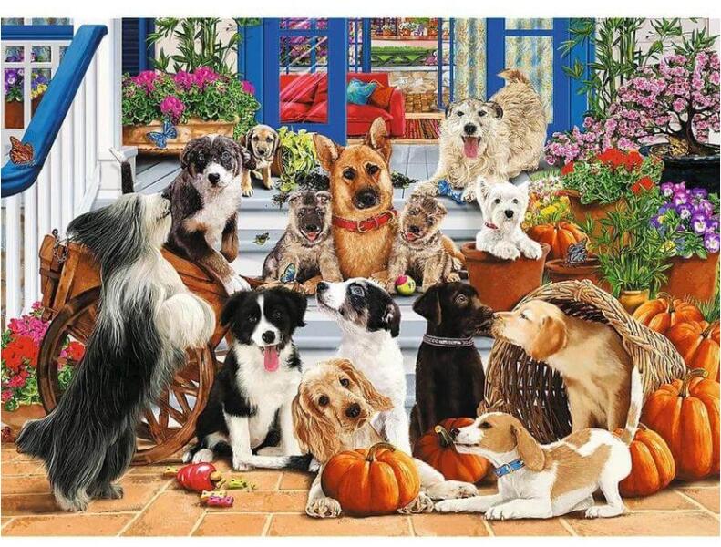 Cuki kutyák, kicsik és nagyok elevenednek meg a Trefl 20212 - Kutya barátság - 1000 db-os Wooden Puzzle  vidám hangulatú képén. A puzzle 100 db egyedi formájú figurát is tartalmaz.
