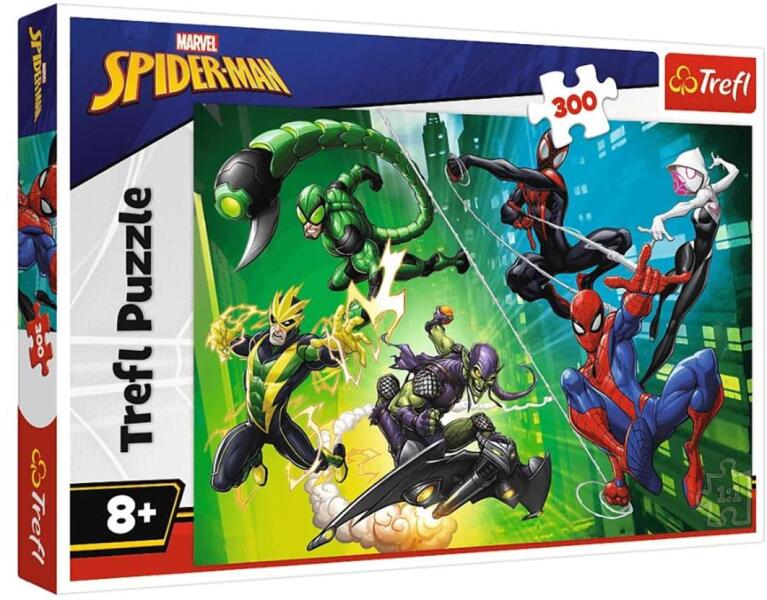 A bátor Pókember elevenedik meg a Trefl 23036 - Pókember - 300 db-os puzzle  képén szövetségesei és ellenségei körében. Egy igazi akciódús jelenet a rajongók legnagyobb örömére.