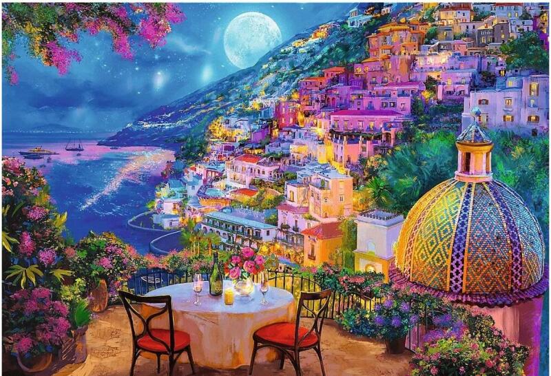 Romantikus olasz tengerparti jelenet, Positano színes házaival és mediterrán hangulatával. A Trefl 26218 - Randevú Positanóban - 1500 db-os puzzle  igazi álomkirakó az olasz életérzés és a romantika szerelmeseinek.