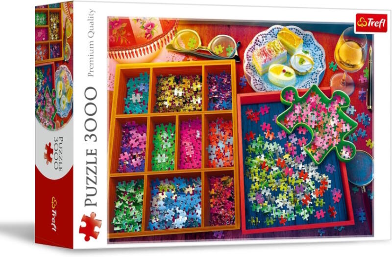 A Trefl 3000 db-os puzzle - Rejtvényes est képén lélegzetelállítóan színes kirakó darabok láthatók, melyek éppen arra várnak, hogy egyetlen csodás képpé álljanak össze.