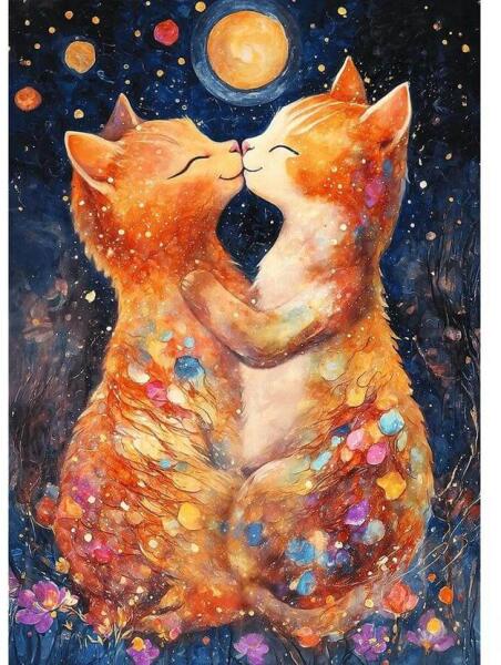 Két bájos cica a csillagos ég alatt. A Trefl 37546 - Egy csók a holdfényben - 500 db-os puzzle  a macskák és a romantika kedvelőinek készült.
