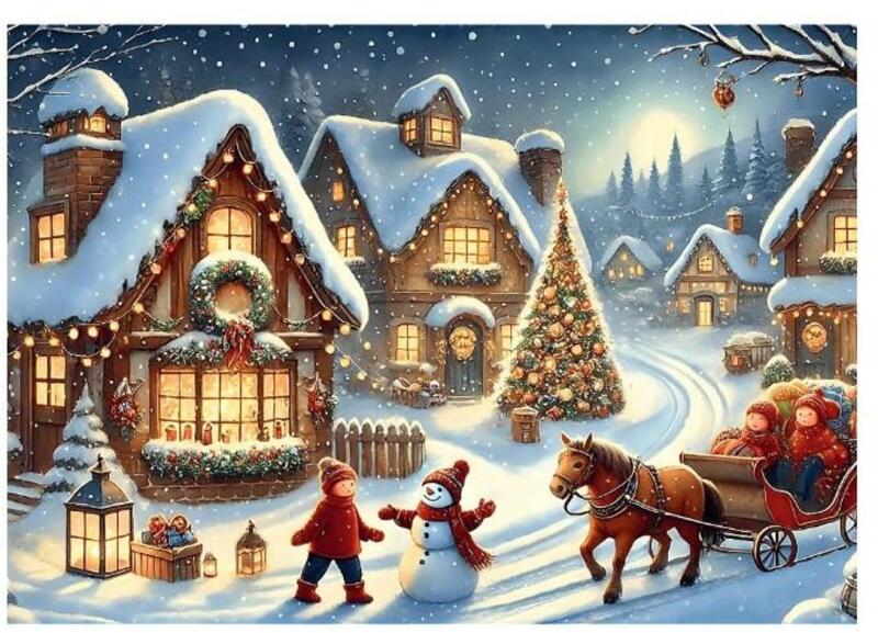 Éld át a téli ünnepek hangulatát egy színes puzzle formájában. Hangulatos, hófödte házikók, karácsonyi fények, egy hóember, egy karácsonyfa és egy lovasszán kelnek életre a Trefl 99282 - Ünnepi szán - 1000 db-os puzzle képén. A részletek melegséget és örömöt sugároznak.