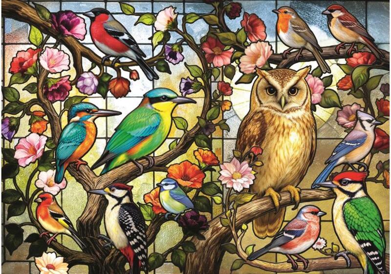 A Trefl  kirakók kiváló minőségű, speciális fényvisszaverő papír felhasználásával, ökológiai anyagból készülnek, amely megkönnyíti az összeillesztést. A Trefl 1000 db-os puzzle - Színes üvegmadarak (99306)  kirakó képen színes üvegmadarak láthatók, amelyek ragyogó felületükkel a fényben tündökölnek.