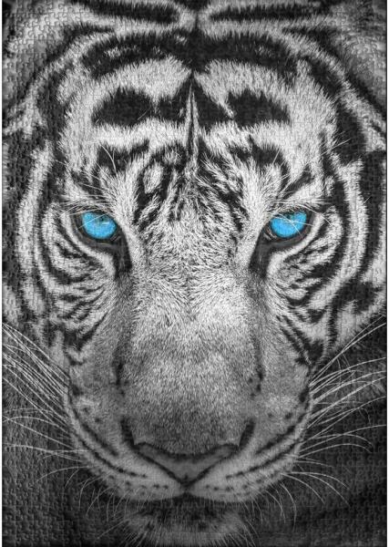 Egy lenyűgöző tigris portrét ábrázol az Ulmer 0008 - The Hunter - 1000 db-os puzzle . A kép monokróm színvilágaizgalmasvizuális élményt nyújt az élénk kék szemekkel.