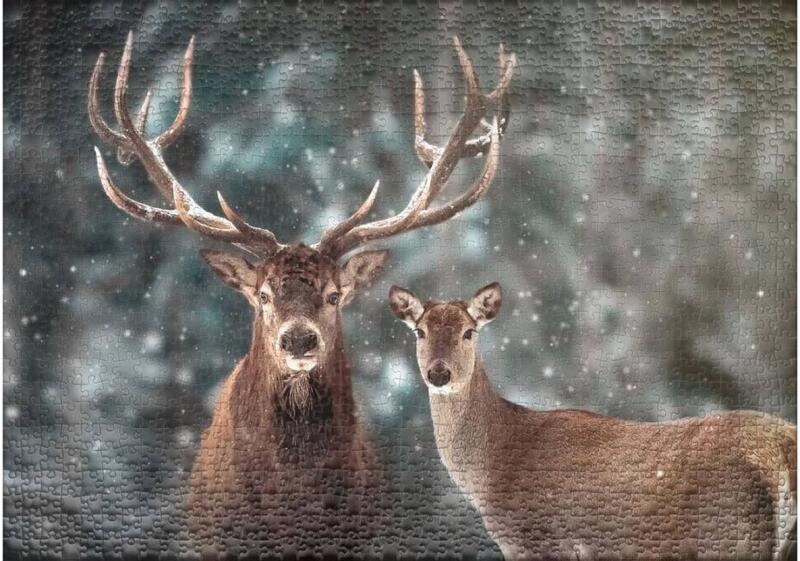 Két gyönyörű szarvas a hóesésben. Az Ulmer 0466 - Outdoors Together - 1000 db-os puzzle az állatok és a természet rajongóinak készült.