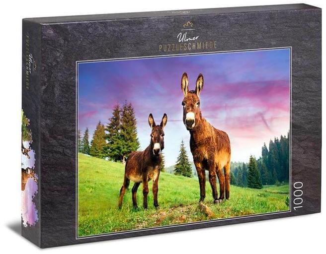 Alpesi háttér és két cuki szamár. Az Ulmer 1000 db-os puzzle - Alpine Donkey (0787) képén a mesés táj és az állatok aranyos jelenete vonzó kirakós élményt kínál.