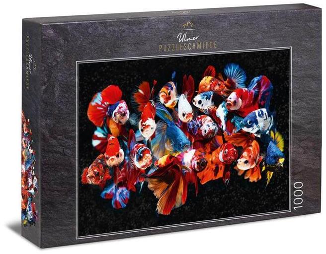 Színes koi pontyok lenyűgöző mintákkal, fekete háttérrel. Az Ulmer 1000 db-os puzzle - Koi (1388) minden darabja izgalmas élményt ígér.