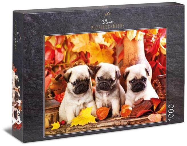 Cuki mopsz kiskutyák őszi hangulatban. Az Ulmer 1000 db-os puzzle - Puppy Happiness (0893) részletgazdag ábrázolás minden darabot szerethetővé tesz.
