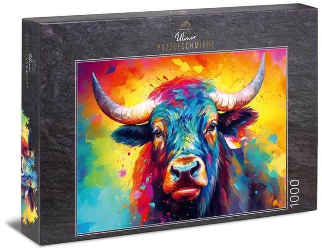 Egy szarvasmarha portréja, színes háttér előtt. Az Ulmer 1000 db-os puzzle - Zenzi (4778) vidám és könnyed hangulatot áraszt.