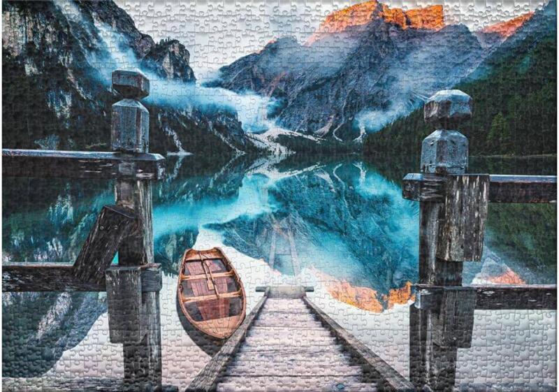 Egy csendes tó tükrözi a környező hegyeket. Az Ulmer 1678 - Wild Lake - 2000 db-os puzzle képe békét és természetközeliséget sugall.