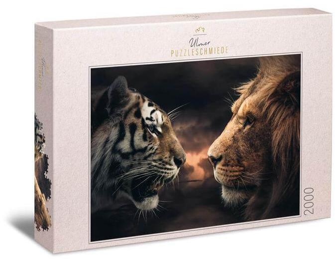 Egy tigris és egy oroszlán néz ferkasszemet az Ulmer 2000 db-os puzzle - Rumble in the Jungle (3382) képén. A kirakó izgalmat és erőt sugároz.