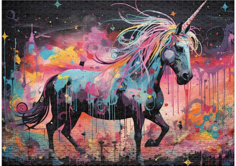 Egy modern egyszarvú-ábrázolás jelenik meg az Ulmer 4044 - Unicorn - 1000 db-os puzzle képén. Ez a kirakú gyermeklelkű felnőtteknek készült.