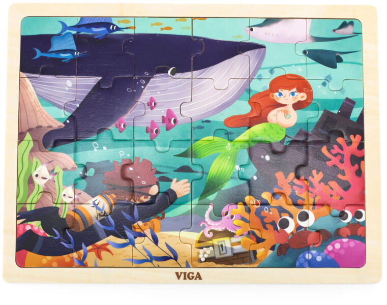 A VIGA Tenger titkaikirak óö sszes darabjaegy fa alapon található, amely nemcsak stabil felületet biztosít a kirakó összerakásához, hanem egy képet is tartalmaz, amelyet a gyermek kirakhat.