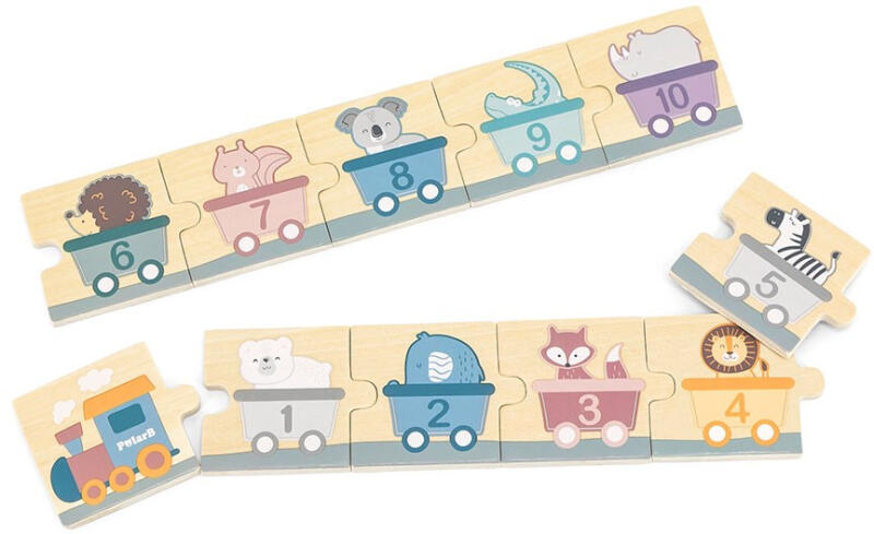 További 11 darab egy mozdonyt tartalmaz, 10 darab pedig 1-től 10-ig terjedő számokkal ellátott, vagonokban lévő állatokat. A móka a kocsik elrendezésében rejlik, pl. a legkisebb számtól a legnagyobbig, vagy fordítva, vagy bármilyen más kombinációban, pl. a választott színű kocsik. A kirakósok biztosan segítenek gyermekének a színek és a számok megtanulásában, valamint a kézügyesség fejlesztésében. Az egész készlet bükkfából készült, és ártalmatlan pasztellszínekkel van festve, amelyek vonzzák a figyelmet és játékra ösztönöznek, miközben sok szórakozást nyújtanak.