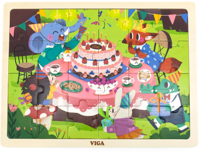 A VIGA Születésnapi Party Kirakó egy sorozat része. A kirakó összes darabja egy fa alapon helyezkedik el, amely nemcsak stabil felületet biztosít a kirakó összerakásához, hanem egy képet is tartalmaz, amelyet a gyermek kitölthet. További segítség, és amely a további tanuláshoz is felhasználható, hogy minden kirakódarab 1-től 24-ig számozott. Ez a segítség segíthet a gyerekeknek abban, hogy ne csüggedjenek el a kirakó kitöltése közben. A Születésnapi Parti kirakó egy képen látható, amelyen boldog állatok láthatók ajándékokkal egy nagy születésnapi torta körül. Tulajdonságok: